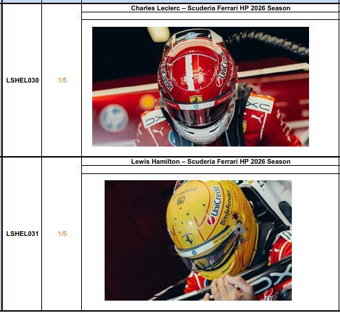3/19 ルックスマート 新製品 ミニカー予約受付開始 ~4/1まで 2026.03.19 LOOKSMART 1/5scale ヘルメット LSHEL030/Charles Leclerc - Scuderia Ferrari HP 2026 Season LSHEL031/Lewis Hamilton - Scuderia Ferrari HP 2026 Season 上記2点予約者に限り定価¥9,000→10%OFF¥8,100(税込¥8,910) 2026年第3 四半期発売予定 4/1(水)まで予約受付中 ご予約は先着順とさせていただきます。 ← Prev Next →