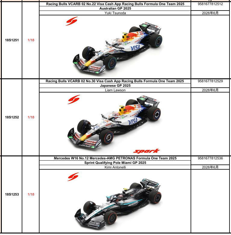 4/3 SPARK 1/18 F1 2025 ミニカー予約受付開始 ~4/11まで